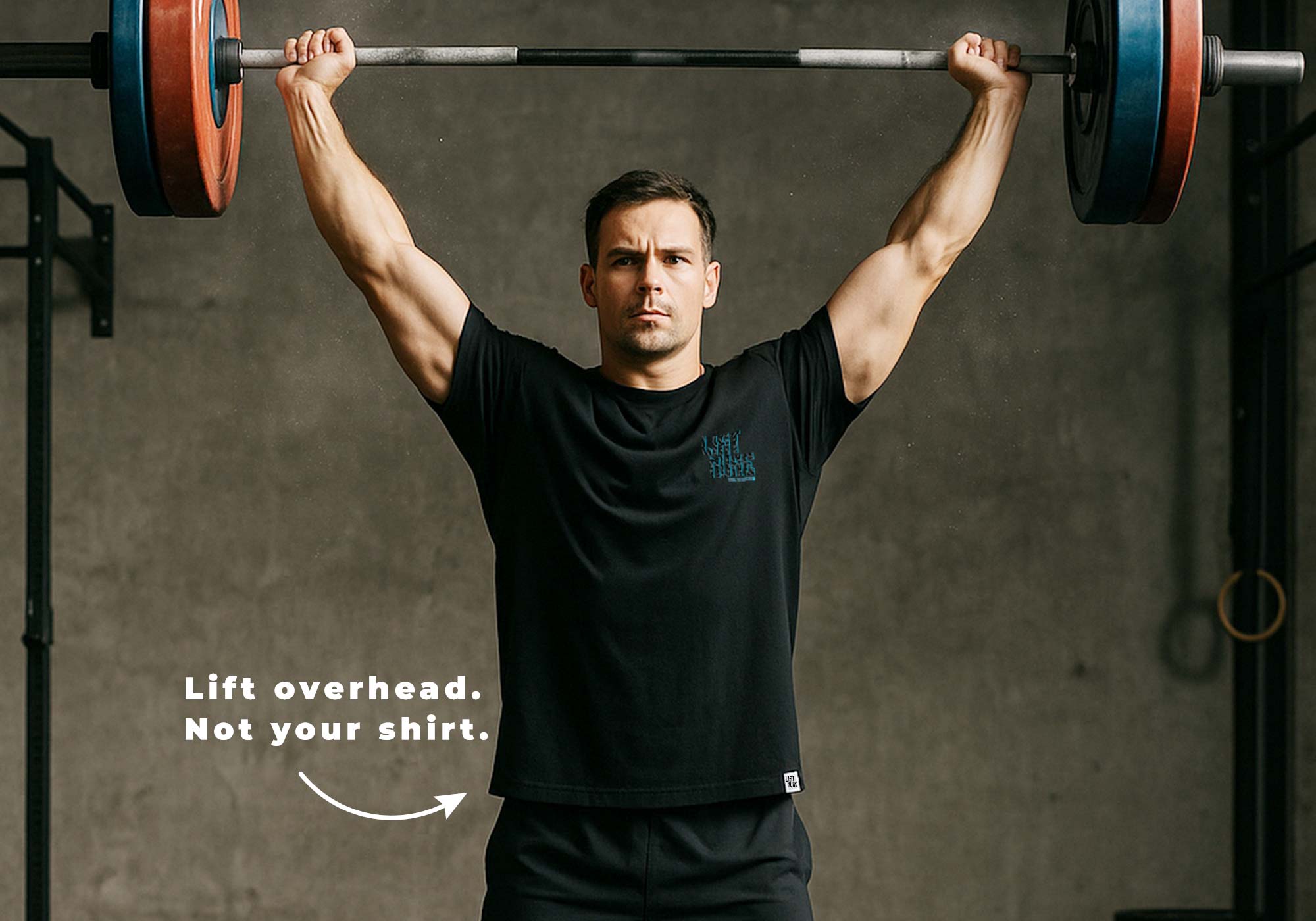 Unser Shirt bleibt da, wo es hingehört – egal wie hart du liftest. Entwickelt für Athleten, die nicht nur stark aussehen wollen, sondern es sind.